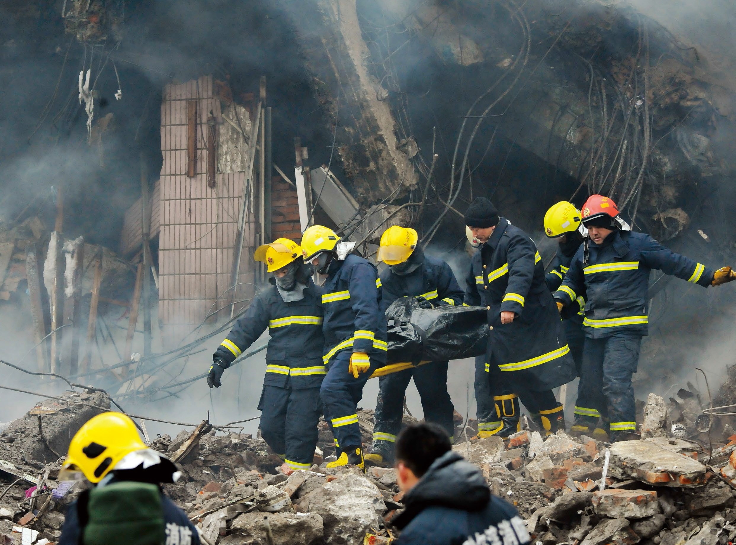 21 时37 分,因建筑上部毫无征兆地发生垮塌,引发建筑构件砸落,导致相邻建筑结构严重破坏,使得正在底层建筑临街窗台上出水施救的多名消防官兵被埋压。官兵迅速展开救援,利用牵引车和破拆车吊升重物,搜救被埋压官兵。看到战友被埋,一些战士一边呼喊着战友的名字,一边徒手攀爬救战友。战友们在零下20 摄氏度的气温下含泪战斗。