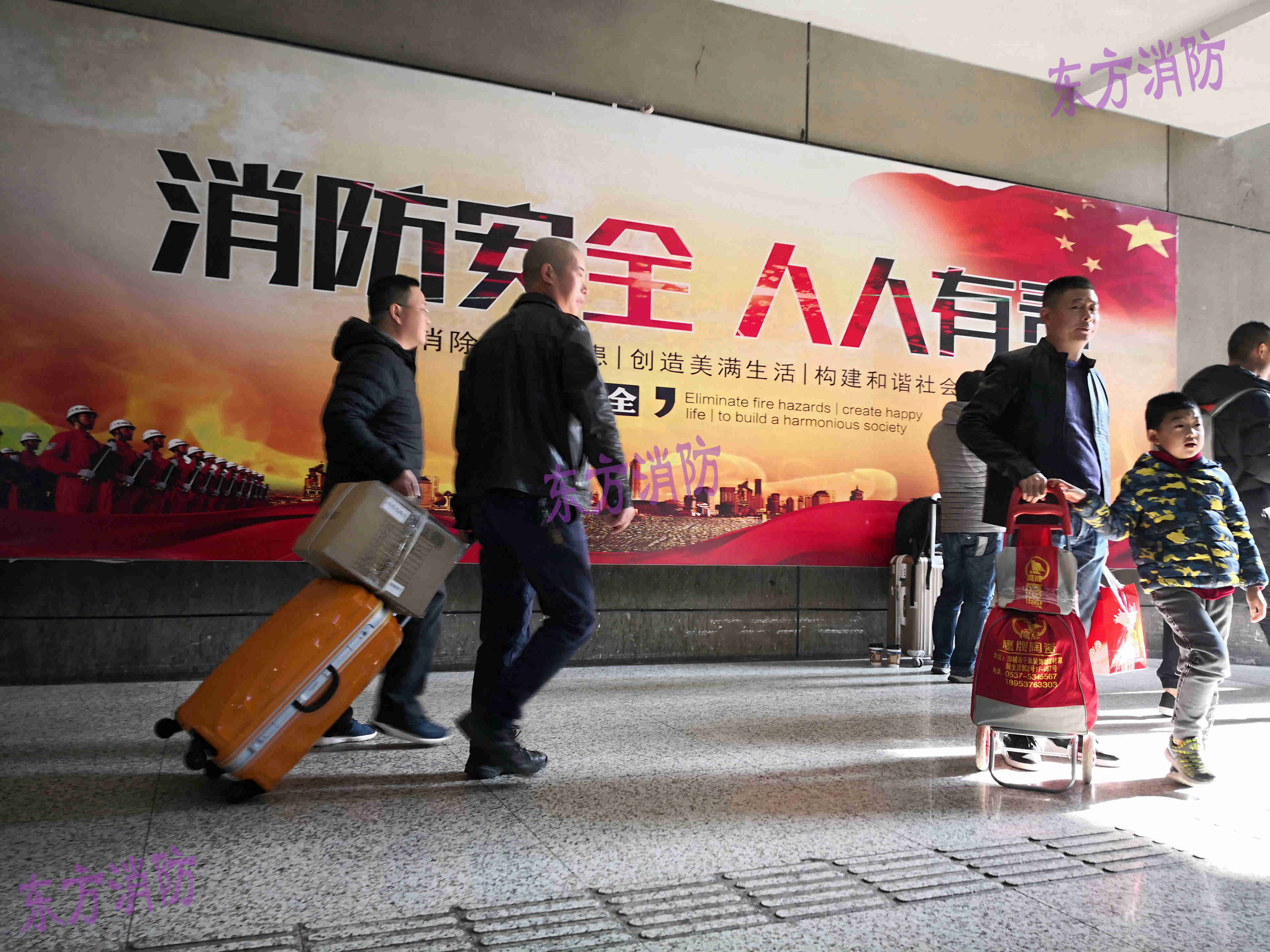 一年一度的春运大幕已开启。2019 年春运自 1 月 21 日起至 3 月 1 日止,共计 40 天。长三角铁路预计发送旅客 7470 万人,计划增开 251 对客车。为迎接大客流到来,确保旅客列车安全,上海虹桥火车站努力营造消防安全氛围,积极强化旅客消防安全意识。图为大幅春运消防安全宣传画前的返乡旅客。
